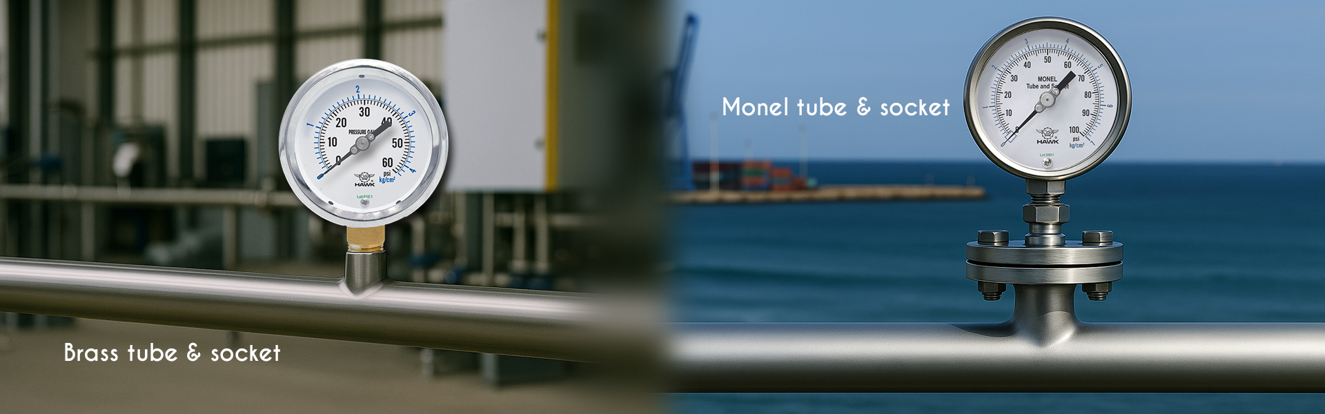 HAWK 21L and 21B series bourdon tube stainless steel case pressure gauges are designed to fulfill the requirements of high quality from various industries. The wetted parts can be in brass or monel. The Monel Tube & Socket wetted parts allow the user to install the gauge in some particular application such as sea water. It is offered with waterproof and corrosion resistant case. Widely pressure ranges can be chosen. Liquid filled is available to diminish the effects of vibration, pulsation and shock and further enhances the gauge life.